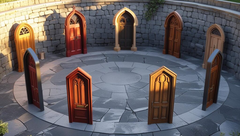 The 8 Doors reflect actions, opportunities, and potential outcomes. Each door symbolizes a type of activity or result.